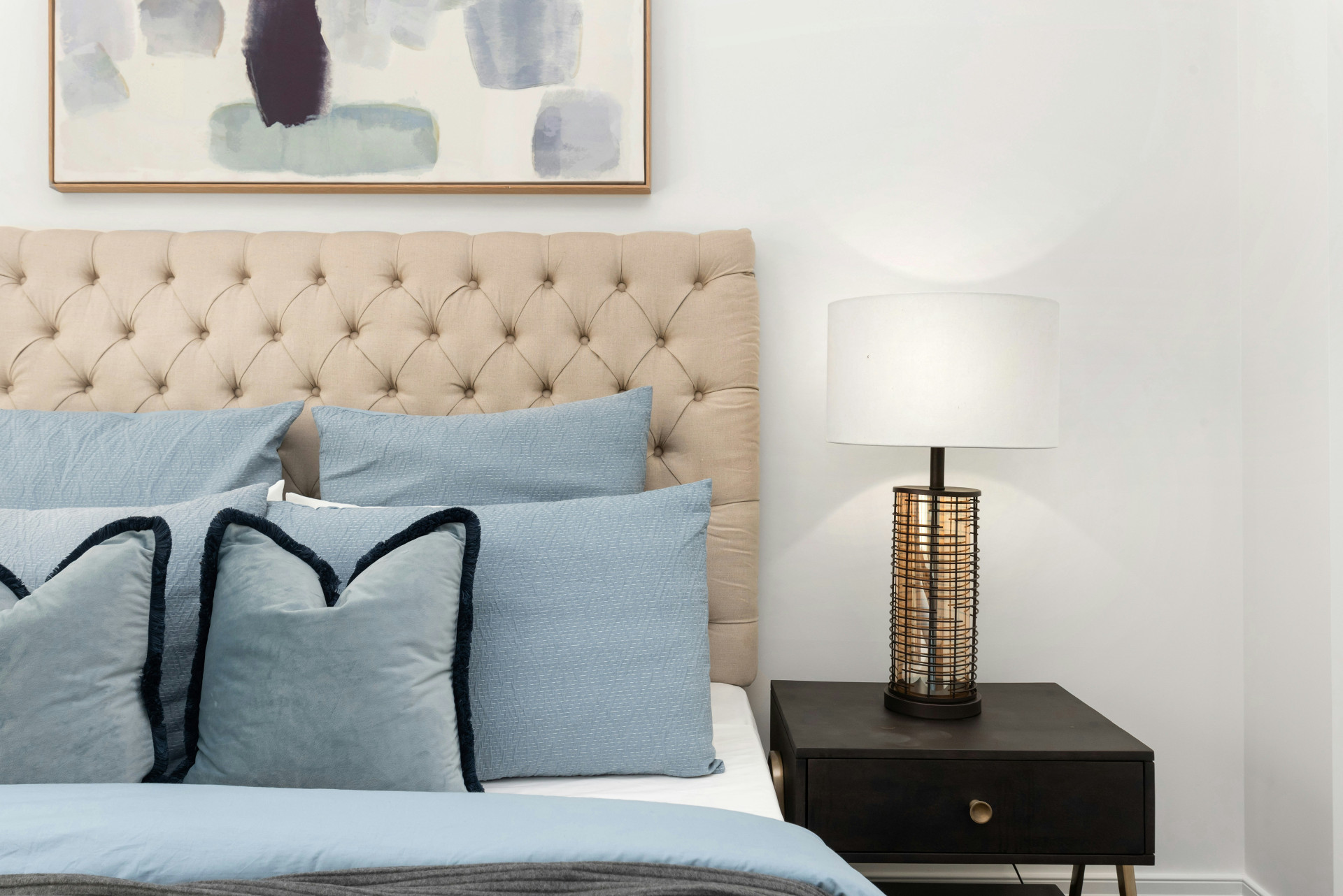 En enkel hylde eller et lille bord uden opbevaring passer perfekt til et minimalistisk soveværelse. De giver et luftigt udtryk og er nemme at kombinere med forskellige sengestilarter.